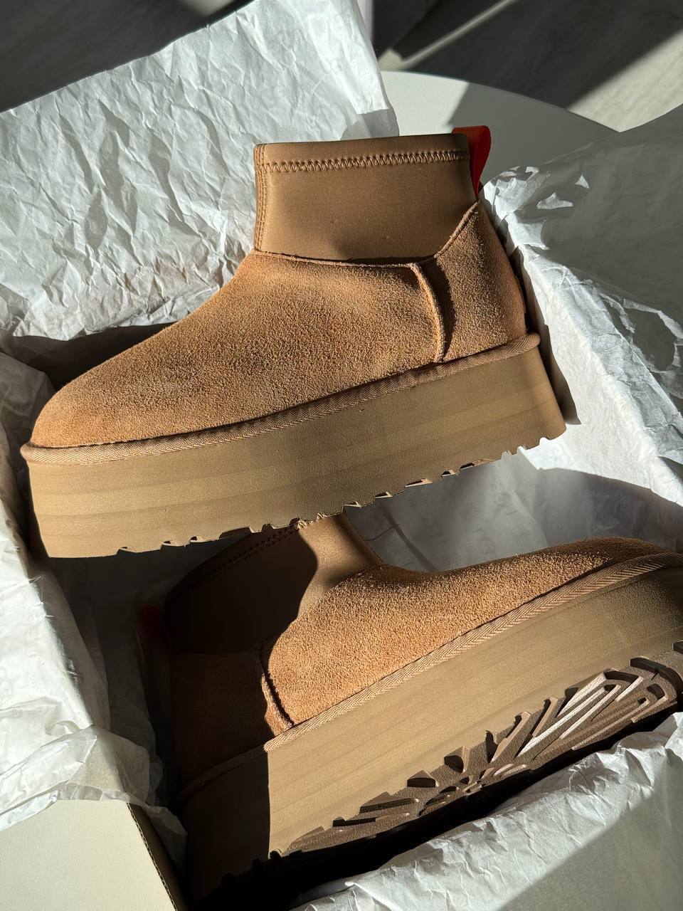 Пока все кричали, что угги – ужасная обувь, дизайнеры создали мини-угги, при виде которых все замолчали на минутку, а потом начали кричать, что им это очень надо. И вам тоже очень нужны классические коричневые мини-угги на удобной платформе.
